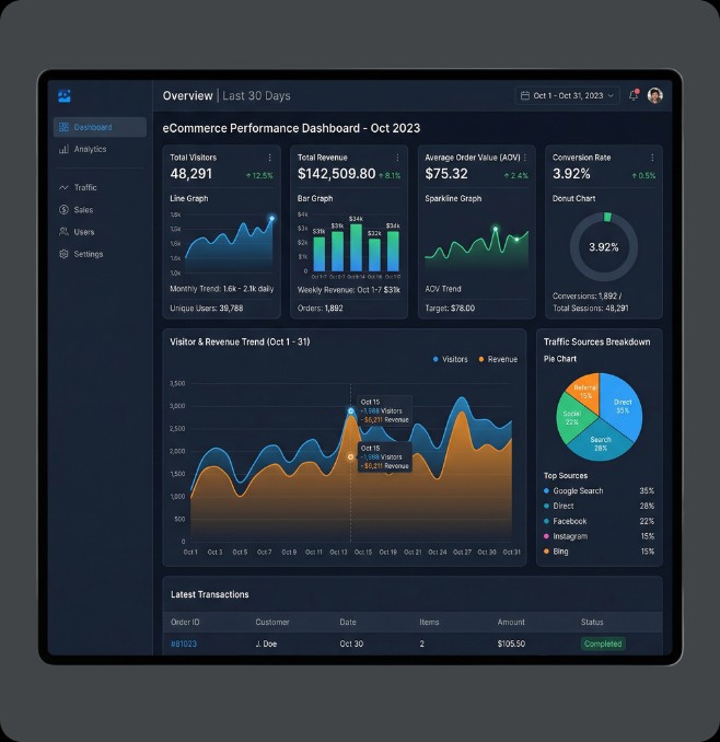 Our comprehensive dashboards offer overviews of everything needed when you need to see it. Analytics including site visitors, revenue, AOV, conversions and more will help you be able to steer the ship when running your business. Our developers can implement and scale solutions ensuring smooth and reliable communication across all your systems.